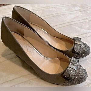 JESSICA SIMPSON Seley Wedge Gray Suede heels w/crystal accents & bows - size 8.5