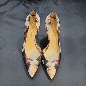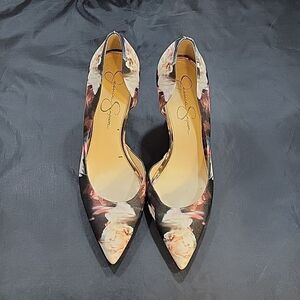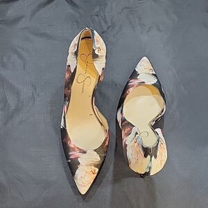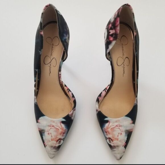 JESSICA SIMPSON WOMEN'S CLAUDETTE FLORAL D'ORSAY CLASSIC POINTED TOE PUMP HEELS 10M/40 COLOR BLACK PINK,GREEN Sexy dorsay pump made by Jessica Simpson. Women's Leather / fabric upper Memory foam midsole Heel Height measures approximately 4" inched synthetic sole Made by Jessica Simpson THIS ITEMS IS PRE-OWNED EXCELLENT CONDITION WITH ONLY LIGHT SIGNS OF WEAR IF ANY CHECK THE PICTURES