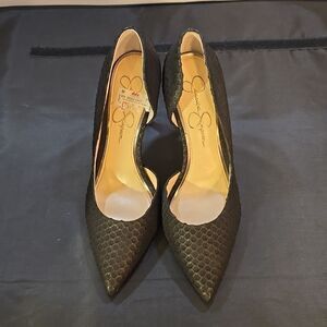 JESSICA SIMPSON WOMEN'S POINTED-TOES SIDE CUT OUT DRESS HEEL PUMPS SIZE 91/2M COLOR BLACK If you are a fan of pointy toes and stiletto heels, then the Jessica Simpson Folowe Pumps are an apt choice for Leather upper. Synthetic lining.Slide-on construction.Pointed toe and sky-high stiletto heel.Man-made outsole high heels Measurements 4 inchedWeight 8 oz THIS ITEMS IS BRAND NEW WITH TAG NO BOX CHECK THE PICTURES