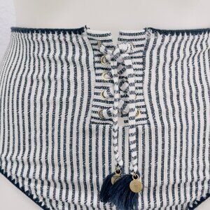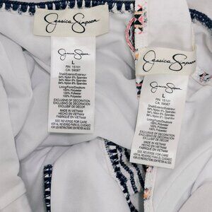 Show off your beach style with the JESSICA SIMPSON Women's Swimsuit. This 2 piece swimsuit features a multi geometric bikini top and bottom, both in size L. Made from a blend of nylon and spandex.