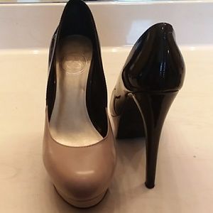 Jessica Simpson round toe. Platform sole, black / beige heels.