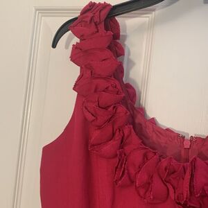 JESSICA HOWARD FIT AND FLARE DRESS SZ 10 - sleeveless- scoopneck- fabric flowers at neckline- fully lined - hidden zipper with hook and eye closure in back -magenta/hot pink- linen blend- small snag at front (unnoticeable) please see last pic