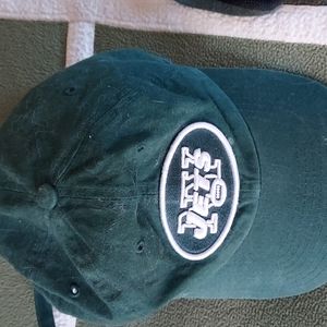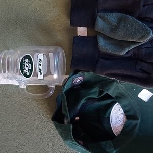 JETS bundle includes drinking mug, gloves, and hat. The gloves are gripper, Forever brand. The hat is adjustable one size, 47 brand, NFL apparel # LA 020238533. The mug is not branded. These are in good shape, gently used.