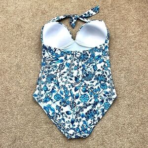 JETS by Jessika Allen Swimsuit/Bathing Suit - One Piece - Sweetheart Neckline - Halter Top Tie - Padded Cups - Gorgeous Blue Floral Design - Made in Australia - Size 8 - No Flaws - Excellent Used Condition!
