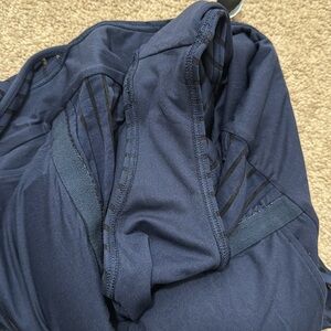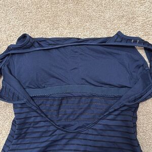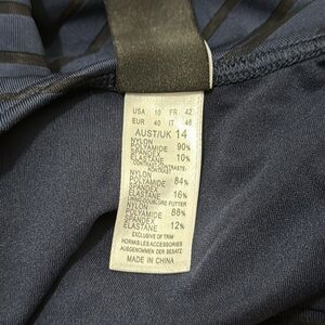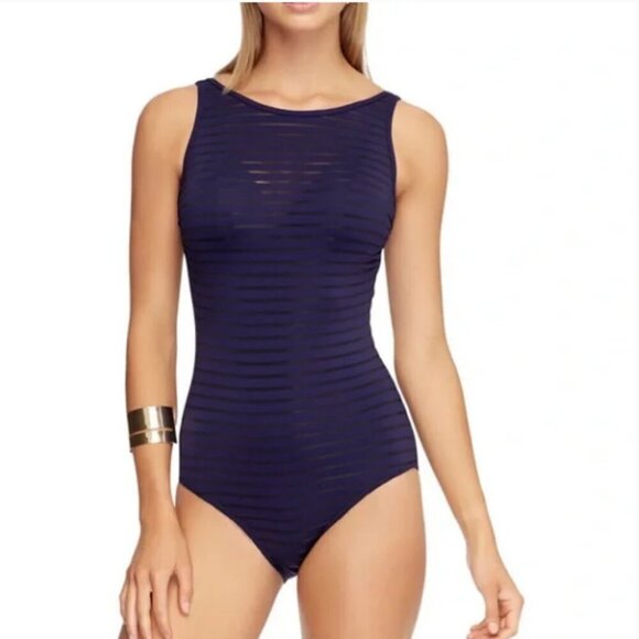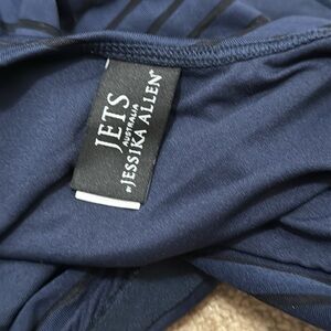 JETS by Jessika Allen Swimsuit/Bathing Suit - One Piece - Ink Parallels Style - High Neck - Clasp Closure with Open Back - Wireless - Built In Shelf Bra with Removable Padding - Navy Blue Wash with Mesh Parallel Lines - Size 10 - No Flaws - Excellent Used Condition!