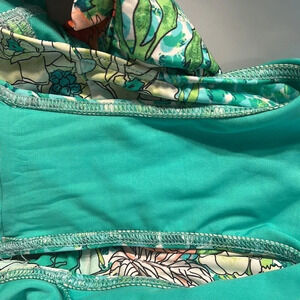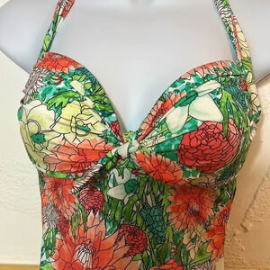 Cute green and orange floral print one piece swimsuit that ties around the neck, back and front bust. Padded cups. In excellent clean worn condition.
