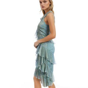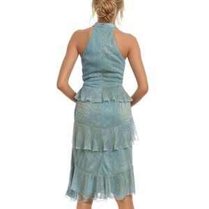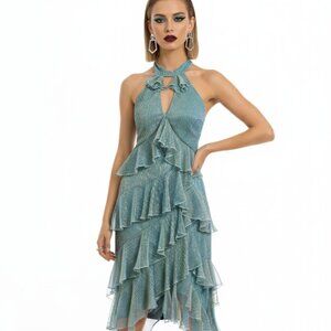 The shimmering, metallic mesh is designed in a dreamy grey-blue hue for a subtle, sparkling effect. A halter neckline frames a daring keyhole cutout that draws the eye to the fitted bodice below. From there, soft, cascading tiers of ruffles flow downward, creating a playful sense of movement. Finished with an asymmetrical hemline that shows off just the right amount of leg, this piece brings an edge to any occasion.