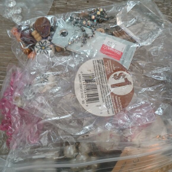 Includes ceramic beads. Plastic and glass beads. Wristwatch face. Faux pearls