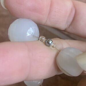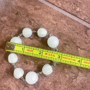 This listing is for a pre-owned, in great condition, possibly Monet stretch bracelet that has beautiful milk white beads with a unique shape of a disco ball and others look like pumpkin shape. Woven in between each are small clear beads and a small silver bead. All of my items come from a smoke-free home but I will mention, for allergy purposes, that I have pets.