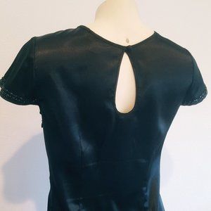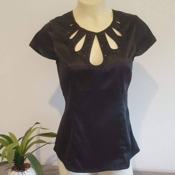 Intricately designed and all about the details w/ this beautiful fitted bodice , invisible side zipper , peep hole detail back with button , sleeve have matching jewels .