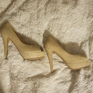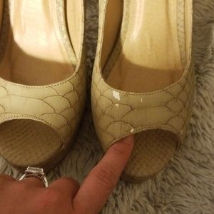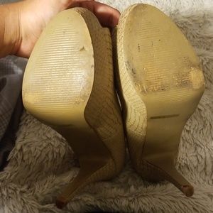 Worn twice at all day functions. Overall good condition with damage from a scratch on the top of the left heel.