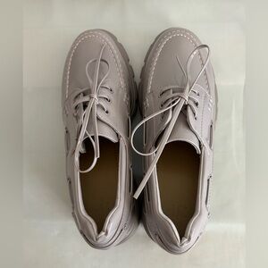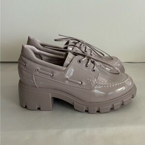 Great conditions JF purple heels. No stains, rips or bad odor. Gently worn. Color light purple. Plastic upper. Can be great for rainy days. Block heel. This shoes are light weight plus comfortable and easy to wear. Pair them with jeans or shorts. Please see pictures for more details.