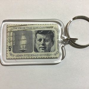 SIZE AND MATERIAL: 2” x 1.50” (inches). Real Postage Stamp inside a Clear Acrylic Base with Metal Loop Ring. (Please Note - Sometimes the stamps are slightly cut to fit inside correctly.)