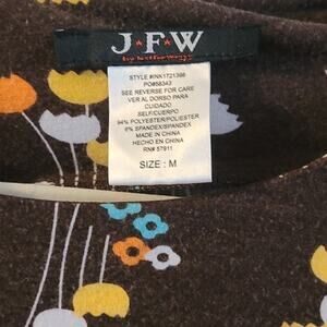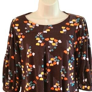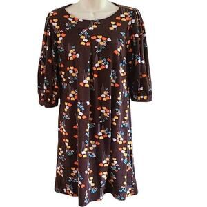 Retro floral dress, puff sleeve dress, brown floral tunic, JFW women’s medium, vintage flower print dress, 70s-inspired fashion, comfortable stretch dress