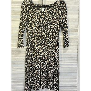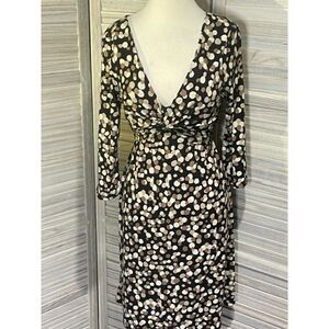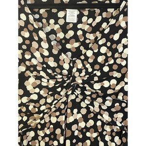 Tieback waist. 3/4 sleeves. V-neck. Gathered bust. 92% polyester, 8% spandex. Machine washable. Made in Mexico. Excellent condition. Nonsmoking home.