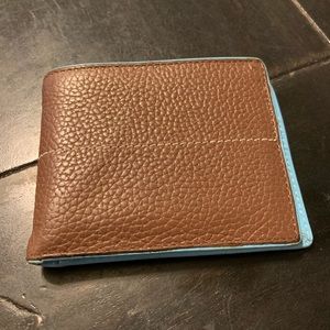 J-Fold wallet. Brown and light blue, eight card inserts and bill envelope.