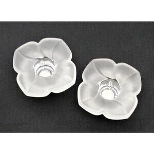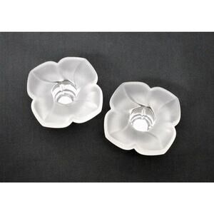 This set of 2 delicate floral candle holders are frosted crystal by Durand. Made in France. They are in excellent condition with no chips or cracks.