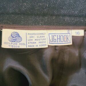 This wool skirt by Jg Hook offers warmth and style. It's dry clean only. Wool skirt, fully lined. One button is loose, two button closure. One part of the lining is Frayed due to age and wear. Comes from a smoke free, pet free home. Please visit my shop for more vintage pieces and I would be happy to bundle shipping for you!