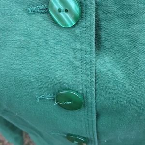 Kelly Green Blazer/Jacket. Has a Button Front. Long Sleeves, Padded Shoulders. Fully Lined. Fitted, Shell is made of 55% Linen, and 45% Cotton. The Lining is made of 100% Polyester.