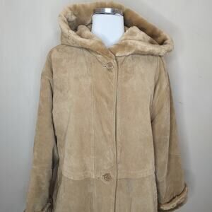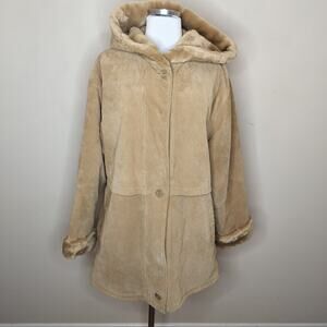 JG Hook suede leather zip up + button up hooded coat. Size L.
