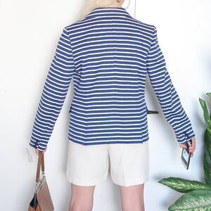 JG Hook striped ponte blazer in blue and white color. One functional pocket on the chest, two decorative on hips. Single-breasted. Look classy having dinner on the outdoor terrace of the restaurant when it's a bit chilly summer evening, or protect yourself from the wind when walking along the seaside on the vacation!