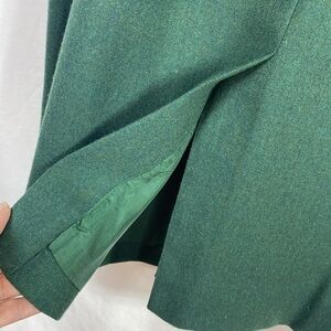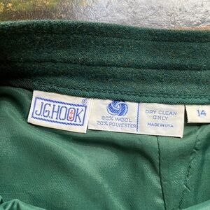 JG Hook Wool Blend Forest Green Size 14 Vintage Skirt with Pockets and fully lined. See measurements to ensure proper fit. Skirt says 14 but measurements come out to being a size small or 6. Good pre owned condition. One Small repaired spot on back of skirt as seen in last photo. Buttons on the side. Slit in the back.