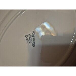 This vintage serving platter is from J&G Meakin in England. It is oval-shaped, white, and fluted, measuring 14" in length and 11" in width. The ceramic platter features a glossy finish and a decorative design. It is an original piece that requires hand washing, and it was made in France using pottery techniques. The brand is known for its quality and unique antique pieces.