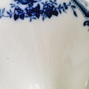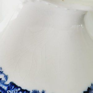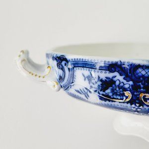 This exquisite Vintage Flow Blue Covered Dish by J&G Meakin, features the York Pattern, embossed with gold accents. Made in Hanley, England, it's a stunning addition to any Flow Blue collection.