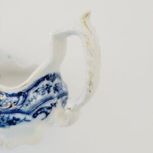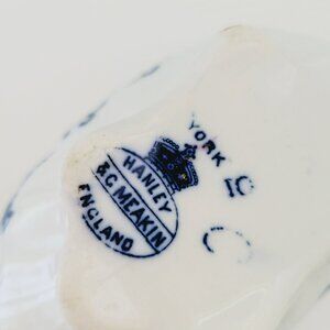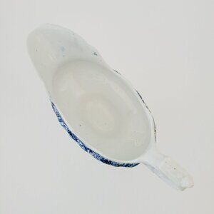 This J&G Meakin Flow Blue Gravy Boat is a stunning addition to your dinnerware collection. Made in Hanley England, this ironstone piece boasts the York pattern and is embossed with gold accents.