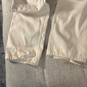 J gate cargo pants, adjustable leg ,100 % cotton with two front pockets, two large side pockets, and two back pockets , like new , cream colored ,wide leg ,size S waist 14 “ inseam 30” rise 11” check all pics and comment with any questions