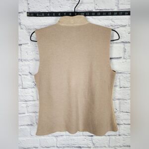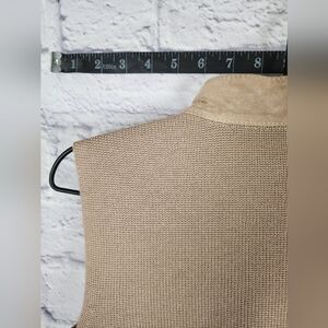 This JH Collectibles vest is a chic and versatile piece that combines classic style with subtle embellishments. It features a soft beige 100% suede fabric on the front, adorned with gold-tone studded details and beadwork along the zippered closure, adding a touch of elegance and sparkle. The back is made of a matching ribbed knit material with a blend of acrylic and cotton for added comfort and flexibility, ensuring a flattering fit. The lining is 100% polyester. The vest is sleeveless, with a high mock neck collar for a polished look. Perfect for layering over a blouse or turtleneck, this vest is ideal for adding a sophisticated touch to any outfit.