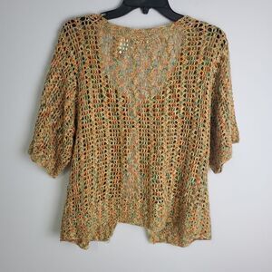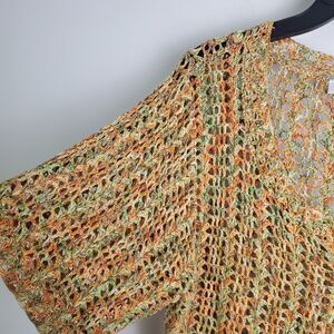 Features: Open-knit cardigan with a multicolor earthy palette, button-up front, and 3/4-length sleeves.