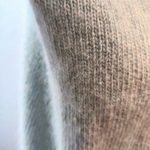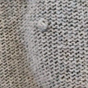 Good condition, minor signs of wear, tiny spot by shoulder sleeve seam, bobble on inside of sweater, very light pilling, no rips, holes or tears, very pretty pale green color, super soft lambswool/angora/nylon blend, open front w/shawl collar