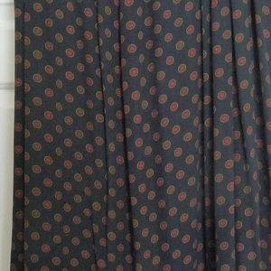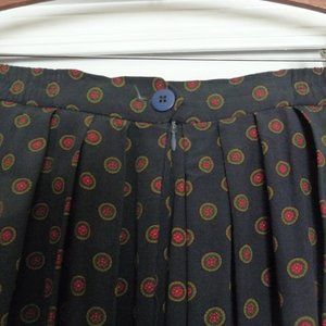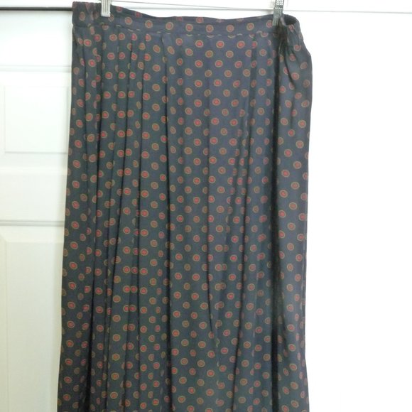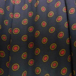 Beautifully finished unlined skirt from the 1990's. Navy with burgundy medallions. Flat front, side elastic. Gathered back with button and zipper closure. Lightweight rayon. Made in USA. Size 24. Specifics, waist 40, hips 54. length 33. Dry clean.