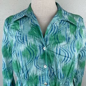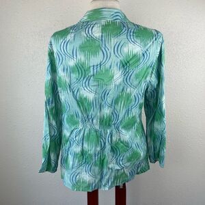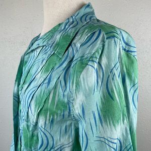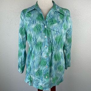 Beautiful and stylish button down shirt by JH Collectibles in excellent preowned condition. It measures 20 inches armpit to armpit laying flat, 16 inches at the waist and 25 inches in length from shoulder to hem.