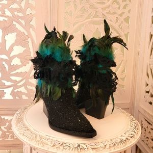 These boots are available by custom order only in your choice of size and available Feather color. No two pairs will be 100% identical as each is hand created. Please allow 1 to 2 weeks for production before this item will ship. Express Production and shipping is available for an additional rush fee. Please ask all questions prior to purchasing this item. This item is a final sale. No returns, refunds, or exchanges allowed. Absolutely no exceptions will be made.
