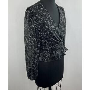 JILL JILL STUART Black White Polka Dot Faux Wrap Blouse.