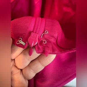 NWT but does have a flaw as shown in picture lining is torn away from the one arm hole needs fixed as shown in picture and the clasp on the back needs sewn better. No other flaws or stains