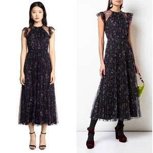 JILL STUART Floral Tulle Sheer Dot Ruffle Flutter Sleeve Pleated Maxi Gown 0
