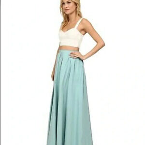 Playful two piece dress from Jill by Jill Stuart. Purchased for a wedding but didn’t end up wearing. Off white bustier crop top with side zipper. Full length ball gown skirt in ice blue. It even has POCKETS! My favorite part of the dress. Color is off white/ice blue.