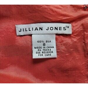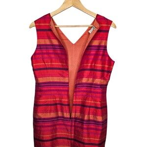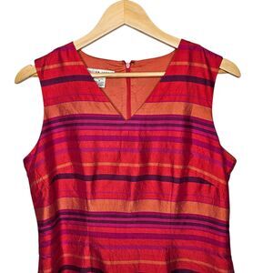 JILLIAN JONES 100% Silk Sheath Dress. Women's Size 8. V-Neck. Pink, Orange and Purple Stripes. Sleek. Small Back Slit. Zipper Closure.