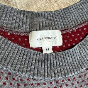 JILL STUART Nordic pattern knit dress, also described as a Fair Isle sweater dress, featuring a grey base with red and white snowflake and geometric patterns.