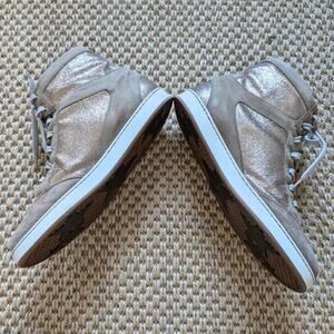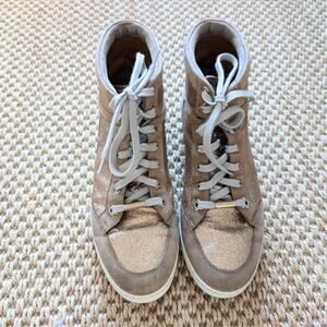 This is a pair of JIMMY CHOO " TOKYO " Glitter Suede Logo High Top Sneakers. Size IT 38/US 8. In great, gently used condition. Please note that the box is broken, as pictured.