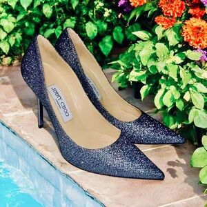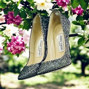You are viewing a pair of Jimmy Choo Abel 100mm Pumps in Anthracite Silver Glitter Metallic EU, 34.5