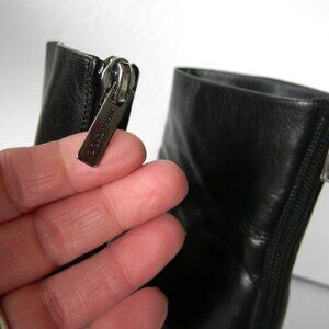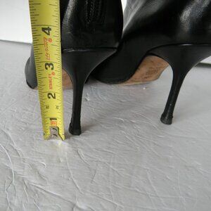 JIMMY CHOO BLACK GLOSSY LEATHER POINTY TOE STILETTO HEEL ANKLE BOOTS SZ 40, OVERALL GOOD USED CONDITION, SOME OVERALL SMALL SIGNS OF USE/WEAR. BACK ZIP ENTRY. 3.5"HEEL.