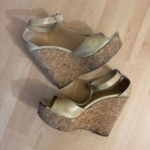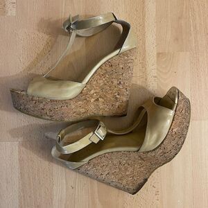 JIMMY CHOO Beige Patent Leather Pela Cork Wedge T Strap Sandals Size 38.5