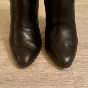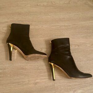 Beautiful black soft leather JIMMY CHOO ankle booties with back zippers and metallic gold on the heels. Great used condition! Heels are slightly scuffed and part of the very bottom of one heel is chipped off (see pics), but otherwise the only signs of wear are on the soles. They come with the original box and dust bag.