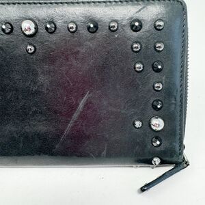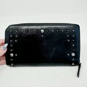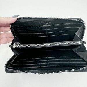 Gorgeous black zipper wallet by Jimmy Choo. Studded and jeweled around the outside. Inside features branding, a lot of card slots, and a zipper coin pouch. See photos for condition. Looks great! Slight scrape on the back as shown.