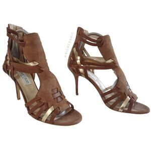 JIMMY CHOO Brown Gold Leather Stiletto Sandals Strappy Heels EU Sz 39 US Sz 8.5