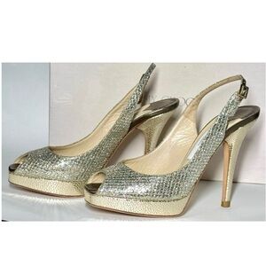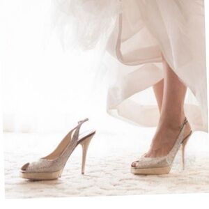 ** these beautiful champagne colored high heel glitter platform sandal pumps are brand new store display. The soles have been refurbished, never worn outside.